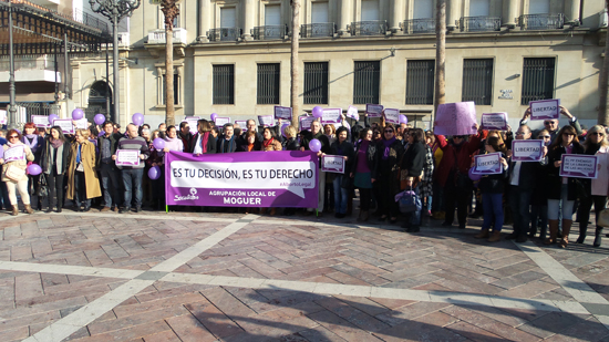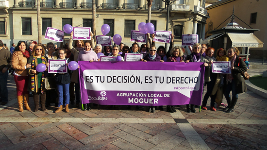 La agrupación local del PSOE de Moguer encabezó el acto de protesta contra el Proyecto de Ley sobre interrupción voluntaria del embarazo del gobierno del PP, el pasado sábado en la plaza de las Monjas de Huelva.