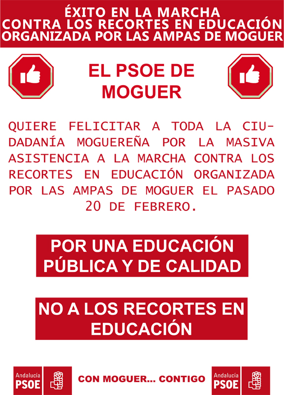 La Agrupación local del PSOE de Moguer informa a militantes y simpatizantes que nos unimos a la marcha convocada por las AMPAS de Moguer en contra de los recortes en educación.