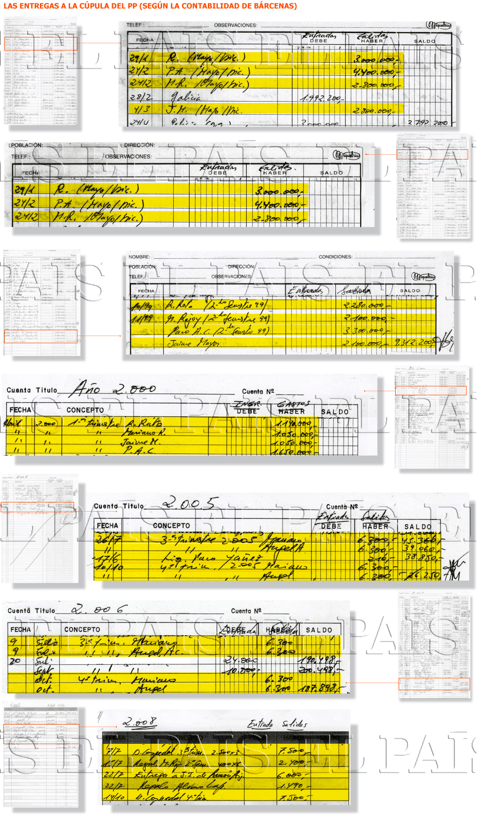 La contabilidad refleja pagos periódicos y continuos desde 1997, siempre con las mismas cantidades (a veces por trimestres y a veces por semestres, en este caso el doble) con el nombre completo de Mariano Rajoy en muchas ocasiones y con iniciales en otras. Al igual ocurre con Ángel Acebes y con el resto de miembros de la cúpula del PP.
