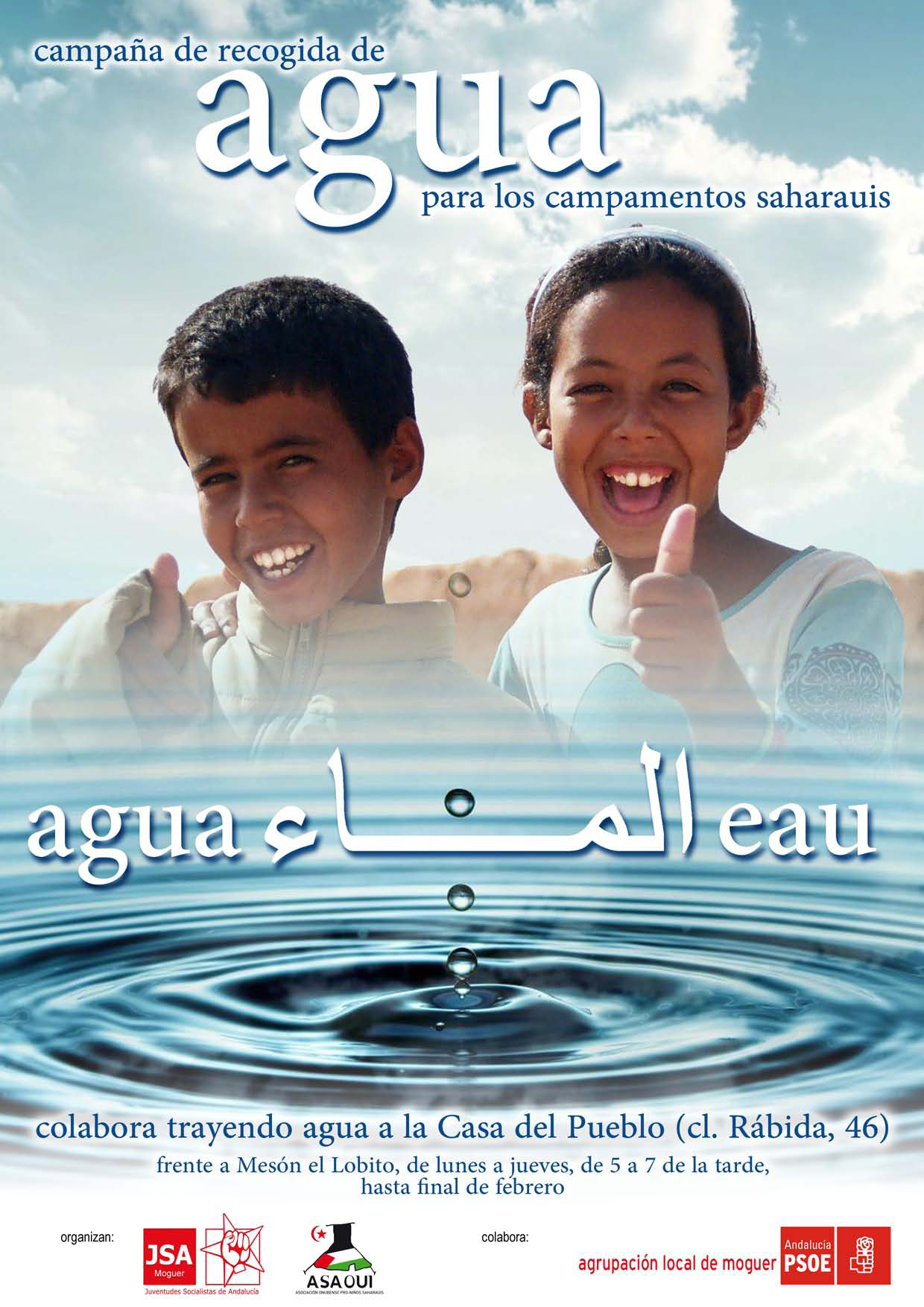 Desde Juventudes Socialistas de Moguer, no quieren hacer oídos sordos a realidades tan alarmantes con las que podemos colaborar con un simple gesto. Los campamentos de refugiados saharauis en Argelia llevan más 30 años resistiendo en el inhóspito desierto bajo las más absolutas restricciones en la disponibilidad, utilización y consumo de agua, cuyas consecuencias afectan a la salud de miles de niños y niñas.