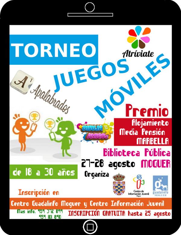 Tras un verano en el que nuestra juventud ha sido protagonista de un importante número de actividades, actualmente el área de Juventud tiene en marcha el ya tradicional Torneo de Juegos móviles, que se celebrará los días 27 y 28 de agosto en la Biblioteca Pública de Moguer (Inscripciones en el Centro de Información Juvenil hasta el 26 de agosto).