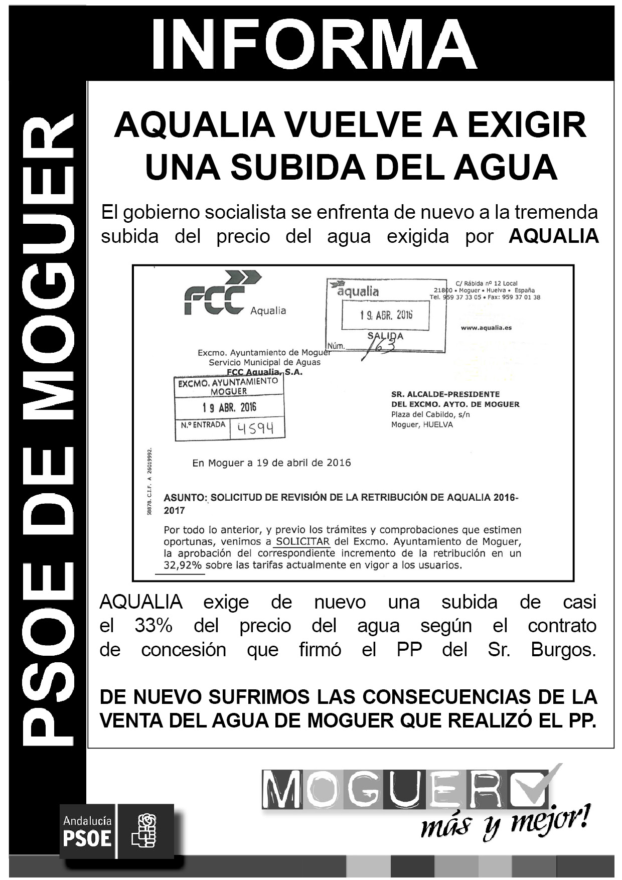 AQUALIA EXIGE UNA NUEVA SUBIDA DEL AGUAPublicado el Jueves, 28 Abril 2016 14:15 | Escrito por Psoemoguer | Visitas: 1356 Tweet < PrevioSiguiente >