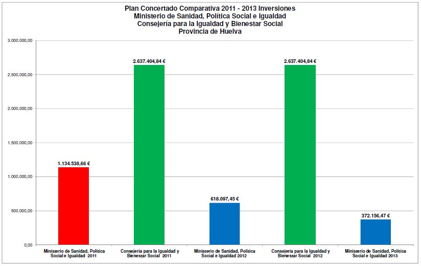 Pero el panorama para 2013 es más desolador todavía. En el proyecto de Presupuestos del Ministerio de Sanidad, Servicios Sociales e Igualdad para este ejercicio se plantea que la partida "A Comunidades Autónomas para Programas de servicios sociales” (aplicación 453 del Programa 231F) baje un 40% respecto a 2012. El grueso de estos Programas, entre los que también se incluyen los proyectos de intervención social integral para la atención, prevención de la marginación e inserción del Pueblo Gitano, corresponde al Plan Concertado. De aprobarse este Presupuesto la aportación estatal a los Servicios Sociales Comunitarios descendería en dos años en un 67%, es decir las Entidades Locales, auténticas receptoras de estos fondos, dejarían de recibir dos de cada tres euros que recibían en 2011. Suponiendo que en 2013 se mantuviesen los mismos criterios de reparto entre las distintas Comunidades Autónomas, a Andalucía le correspondería 5.582.829,84 euros.